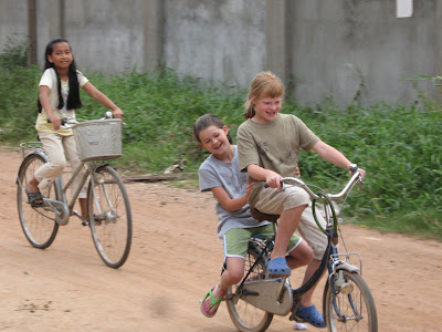 THey're easy to physically operate, it's the traffic that is not so easy to drive in. We borrowed TOm's moto while he was away in Bangkok last week, and with a bit of practice even I could do the quiet streets. You don't need a licence, or a drivers test, just buy one, try it out and hope for the best! We are getting licences though, so that is probably a good thing. With a moto, we'll have more flexibility to get places quicker with just small portions of our family. 5 helmets, and we could probably put up to 3 people on it to get around. SO far, for us all to travel together (which is most of the time) we've been cycling to school--no problem, and we will probably have to still purchase a car in the future. It's been tuktuks since our arrival, which are fun, but DUSTY--in your eyes, covering your body, and the smells of exhaust and pollution on the street are excessive, so a car might be our best option. Not sure I"ll ever truly figure out where we're going here. But we do have city maps, most tuktuk drivers can sort of follow them, and there is relative order to the street names and numbers. Relative, I repeat, relative. I would guess that more than 50% of our "professional"tuktuk drivers here have not really known where we need to go even with an address (in khmer) or with a map. Leave early, take the map, know where you're going so you can give instructions, then you MIGHT be ok. One time I was sure we had a guy who was here for his very first day in Phnom Penh. haha. Actually, turns out he's a pretty nice guy and he drives for us a fair amount now. I think that's because he's always free--if your tuktuk driver is busy all the time, he's probably pretty good, has good english, and can get people to where they want to go reliably.